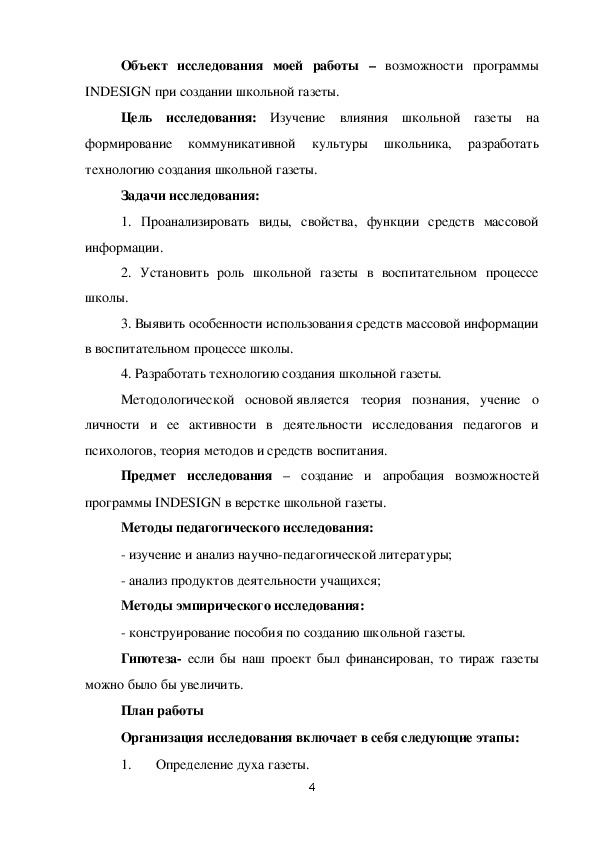 Исследовательская работа на тему: "Исследование возможностей программы INDESIGN при создание школьной газеты". Предмет исследования – создание и апробация возможностей программы INDESIGN в верстке школьной газеты. В данной исследовательской работе полностью пошагово описывается описание создания школьной газеты в программе верстки INDESIGN.