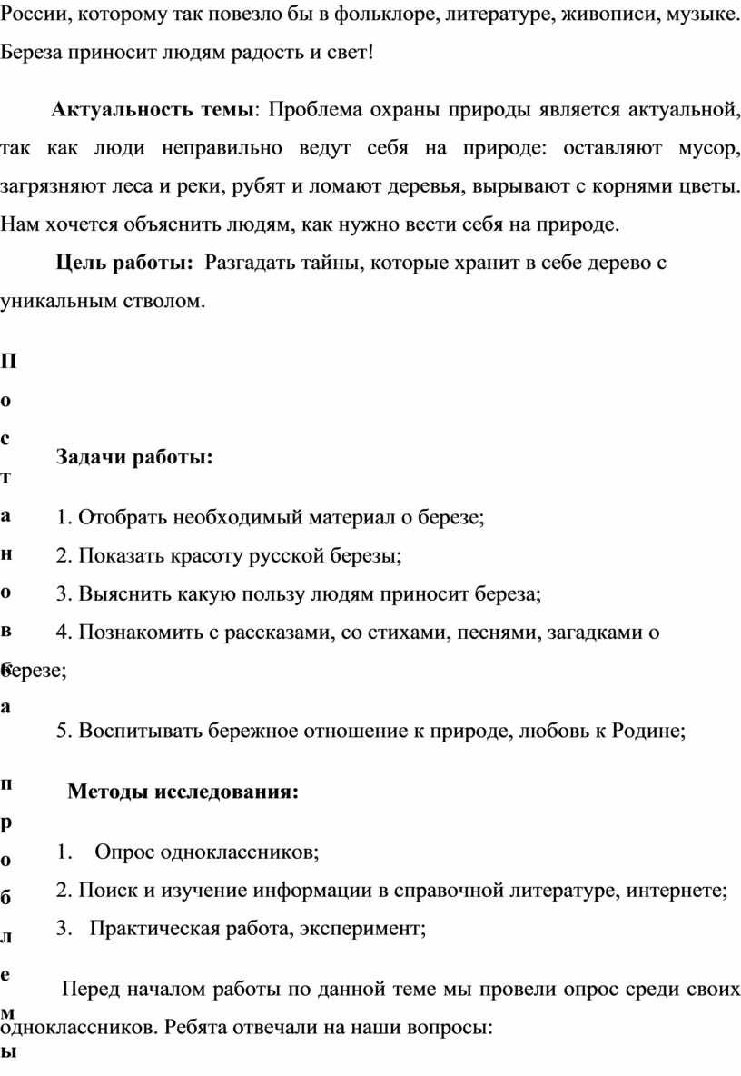 Постановка проблемы: Предположение о том, что береза имеет большое значение в жизни человека, в ходе исследования подтвердилась.