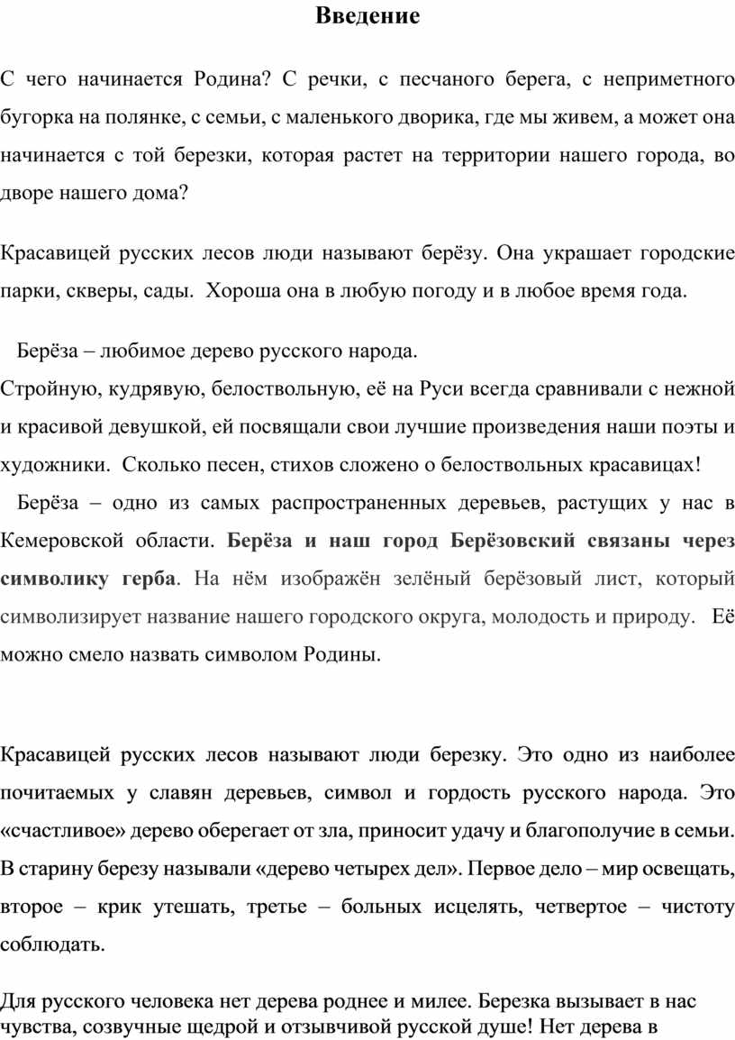 С чего начинается Родина? С речки, с песчаного берега, с неприметного бугорка на полянке, с семьи, с маленького дворика, где мы живем, а может она начинается с той березки, которая растет на территории нашего города, во дворе нашего дома?