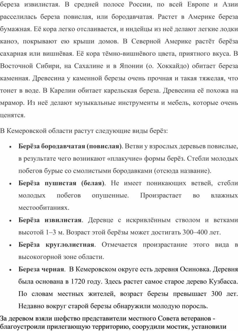 · Береза черная. В Кемеровском округе есть деревня Осиновка. Деревня была основана в 1720 году. Здесь растет самое старое дерево Кузбасса. По словам местных жителей, возраст березы превышает 300 лет. Недавно вокруг старой березы обнаружили молодую поросль.