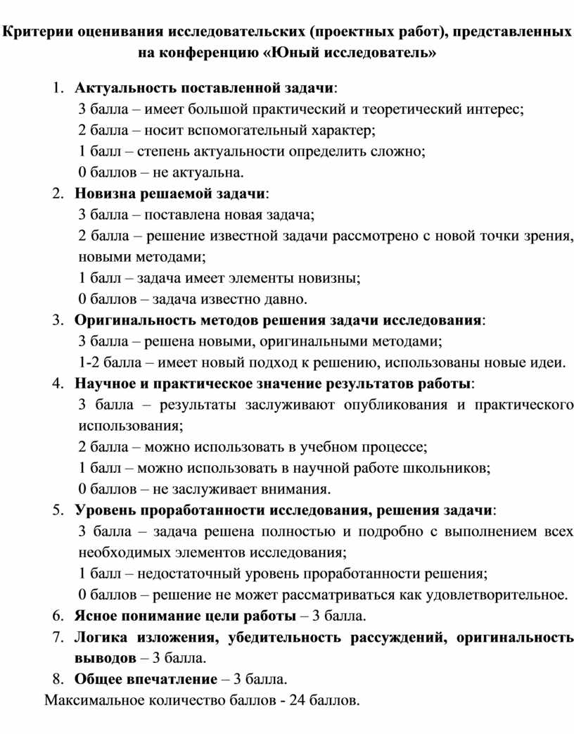 Критерии оценивания исследовательских (проектных работ), представленных на конференцию «Юный исследователь»