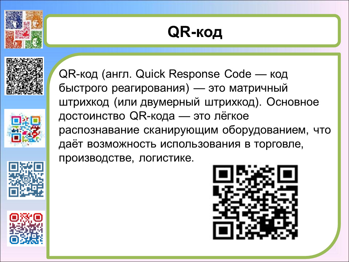 QR-код (англ. Quick Response Code — код быстрого реагирования) — это матричный штрихкод (или двумерный штрихкод). Основное достоинство QR-кода — это лёгкое распознавание сканирующим оборудованием, что даёт возможность использования в торговле, производстве, логистике.