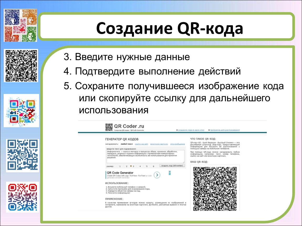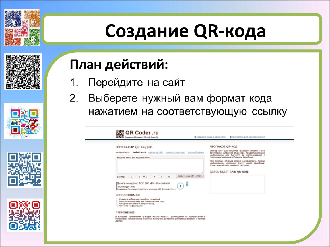 Создание собственных QR-кодов, содержащих различную информацию, на сайте qrcoder.ru