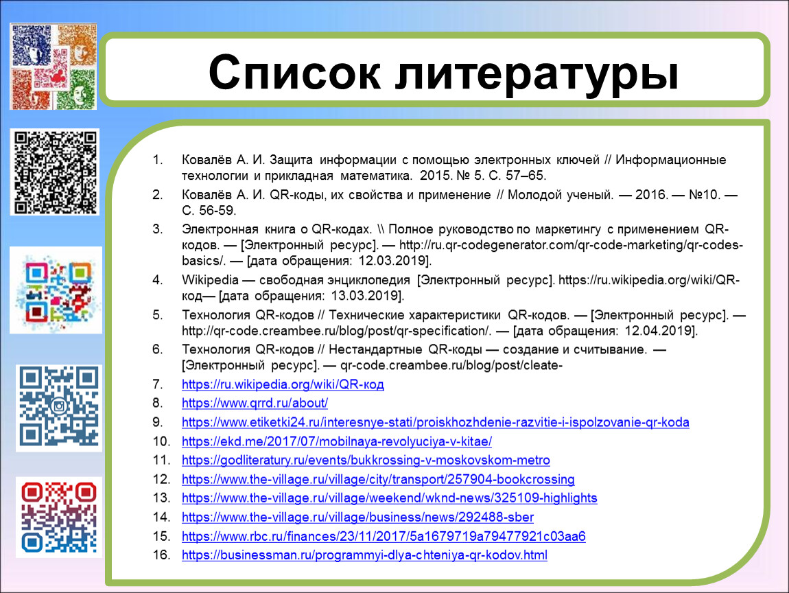 Wikipedia — свободная энциклопедия [Электронный ресурс]. https://ru.wikipedia.org/wiki/QR-код— [дата обращения: 13.03.2019].