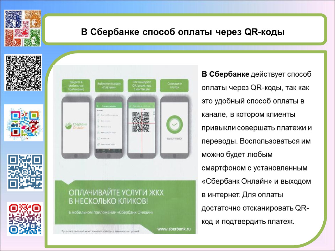 В Сбербанке действует способ оплаты через QR-коды, так как это удобный способ оплаты в канале, в котором клиенты привыкли совершать платежи и переводы. Воспользоваться им можно будет любым смартфоном с установленным «Сбербанк Онлайн» и выходом в интернет. Для оплаты достаточно отсканировать QR-код и подтвердить платеж.