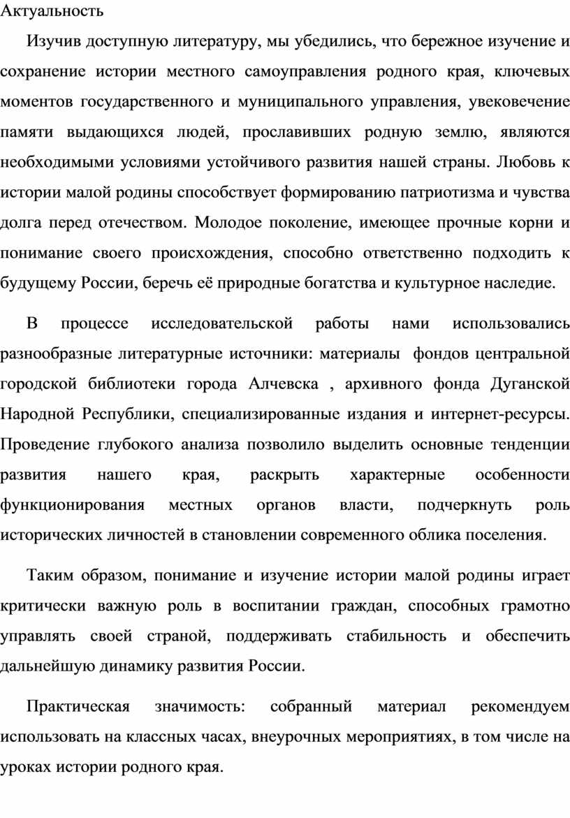 Изучив доступную литературу, мы убедились, что бережное изучение и сохранение истории местного самоуправления родного края, ключевых моментов государственного и муниципального управления, увековечение памяти выдающихся людей, прославивших родную землю, являются необходимыми условиями устойчивого развития нашей страны. Любовь к истории малой родины способствует формированию патриотизма и чувства долга перед отечеством. Молодое поколение, имеющее прочные корни и понимание своего происхождения, способно ответственно подходить к будущему России, беречь её природные богатства и культурное наследие.