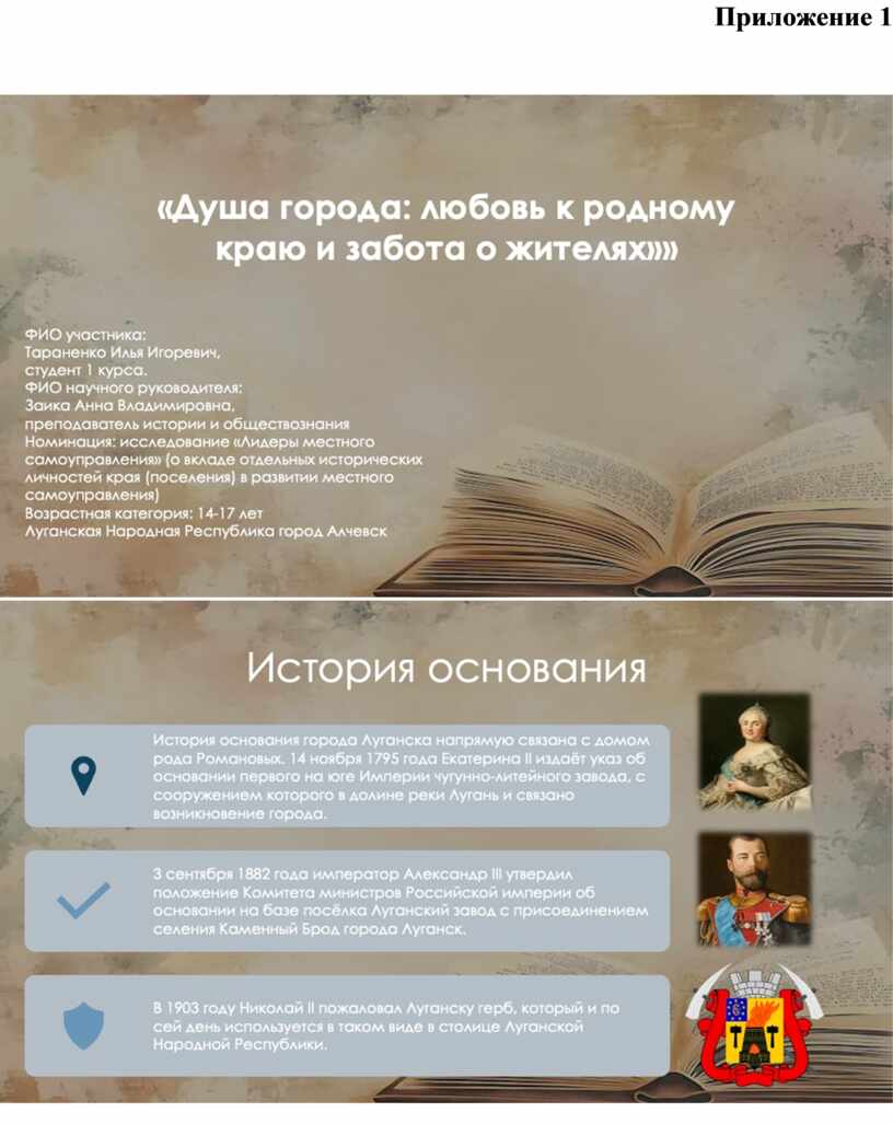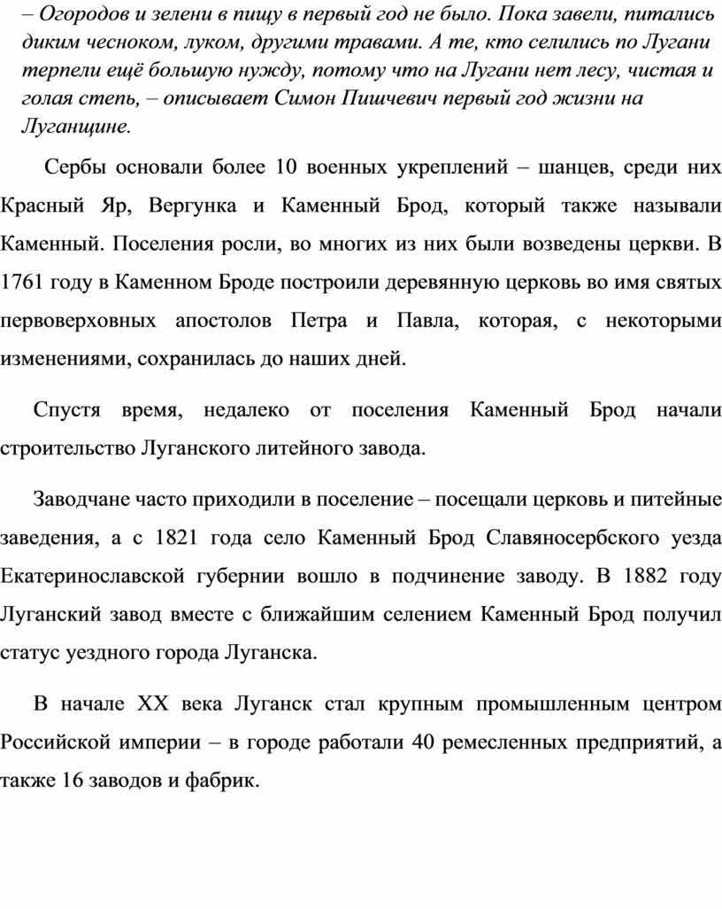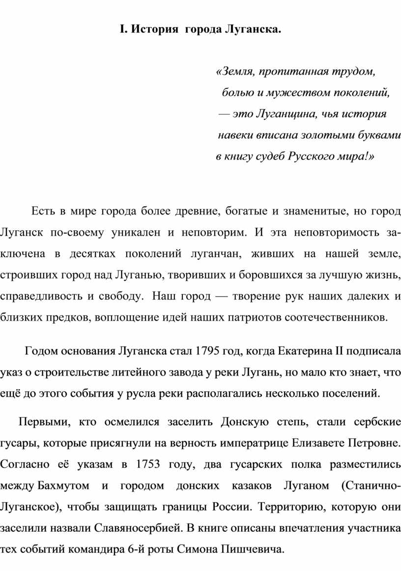 Есть в мире города более древние, богатые и знаменитые, но город Луганск по-своему уникален и неповторим. И эта неповторимость заключена в десятках поколений луганчан, живших на нашей земле, строивших город над Луганью, творивших и боровшихся за лучшую жизнь, справедливость и свободу. Наш город — творение рук наших далеких и близких предков, воплощение идей наших патриотов соотечественников.