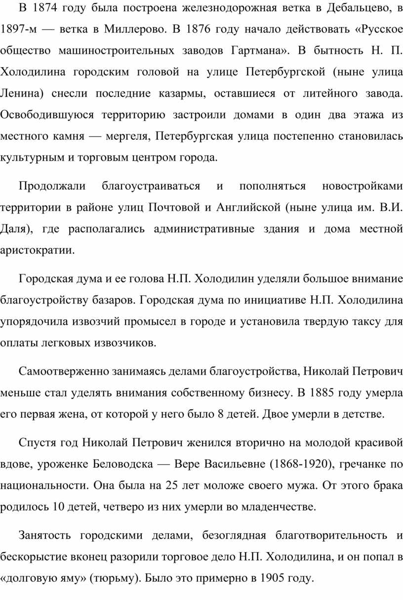 В 1874 году была построена железнодорожная ветка в Дебальцево, в 1897-м — ветка в Миллерово. В 1876 году начало действовать «Русское общество машиностроительных заводов Гартмана». В бытность Н. П. Холодилина городским головой на улице Петербургской (ныне улица Ленина) снесли последние казармы, оставшиеся от литейного завода. Освободившуюся территорию застроили домами в один два этажа из местного камня — мергеля, Петербургская улица постепенно становилась культурным и торговым центром города.