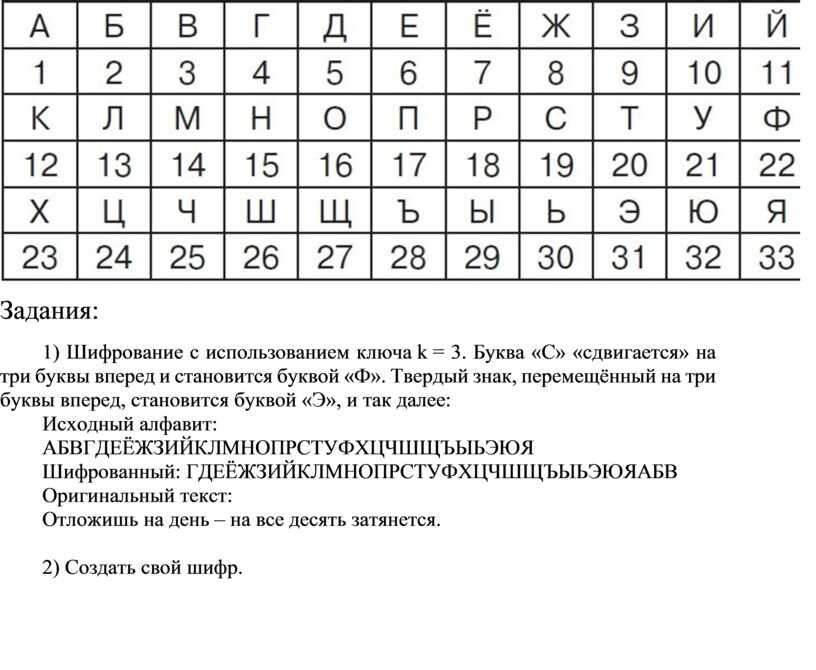 1) Шифрование с использованием ключа k = 3. Буква «С» «сдвигается» на три буквы вперед и становится буквой «Ф». Твердый знак, перемещённый на три буквы вперед, становится буквой «Э», и так далее: