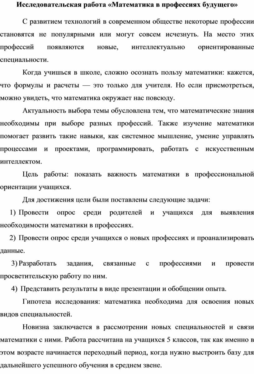 Гипотеза исследования: математика необходима для освоения новых видов специальностей.