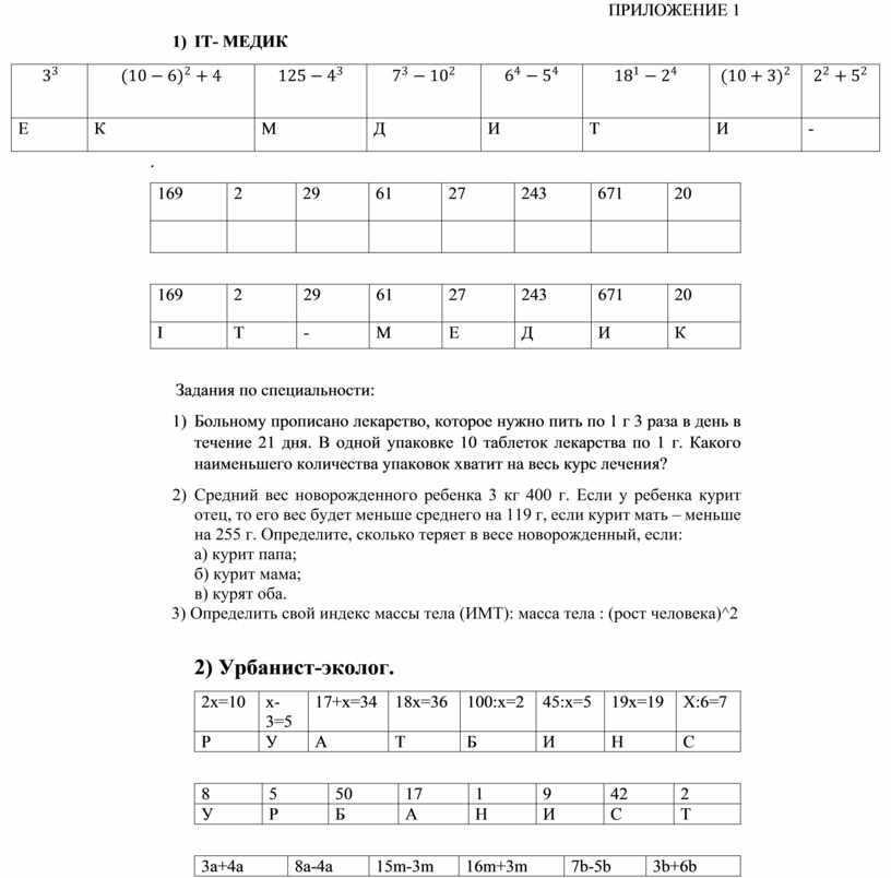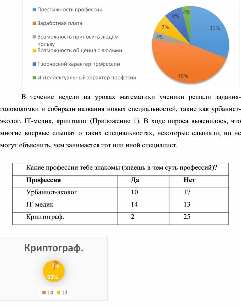В течение недели на уроках математики ученики решали задания-головоломки и собирали названия новых специальностей, такие как урбанист-эколог, IT-медик, криптолог (Приложение 1). В ходе опроса выяснилось, что многие впервые слышат о таких специальностях, некоторые слышали, но не могут объяснить, чем занимается тот или иной специалист.