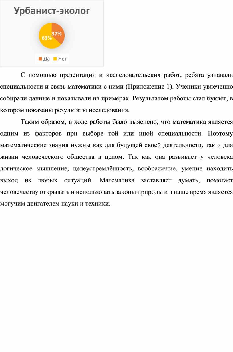 - в ходе такого же опроса учащихся, были получены следующие данные: 63% считают, что в профессии родителей нужна математика, 37%-нет.