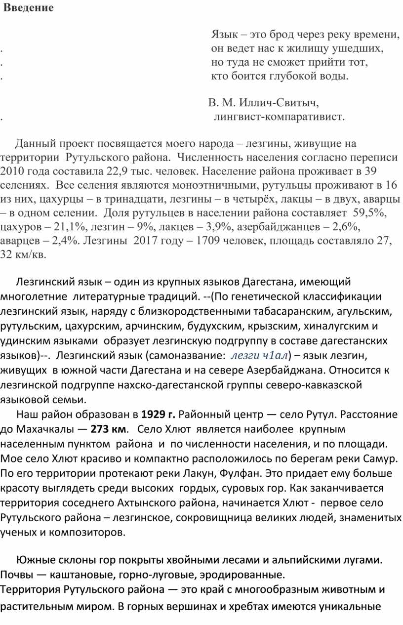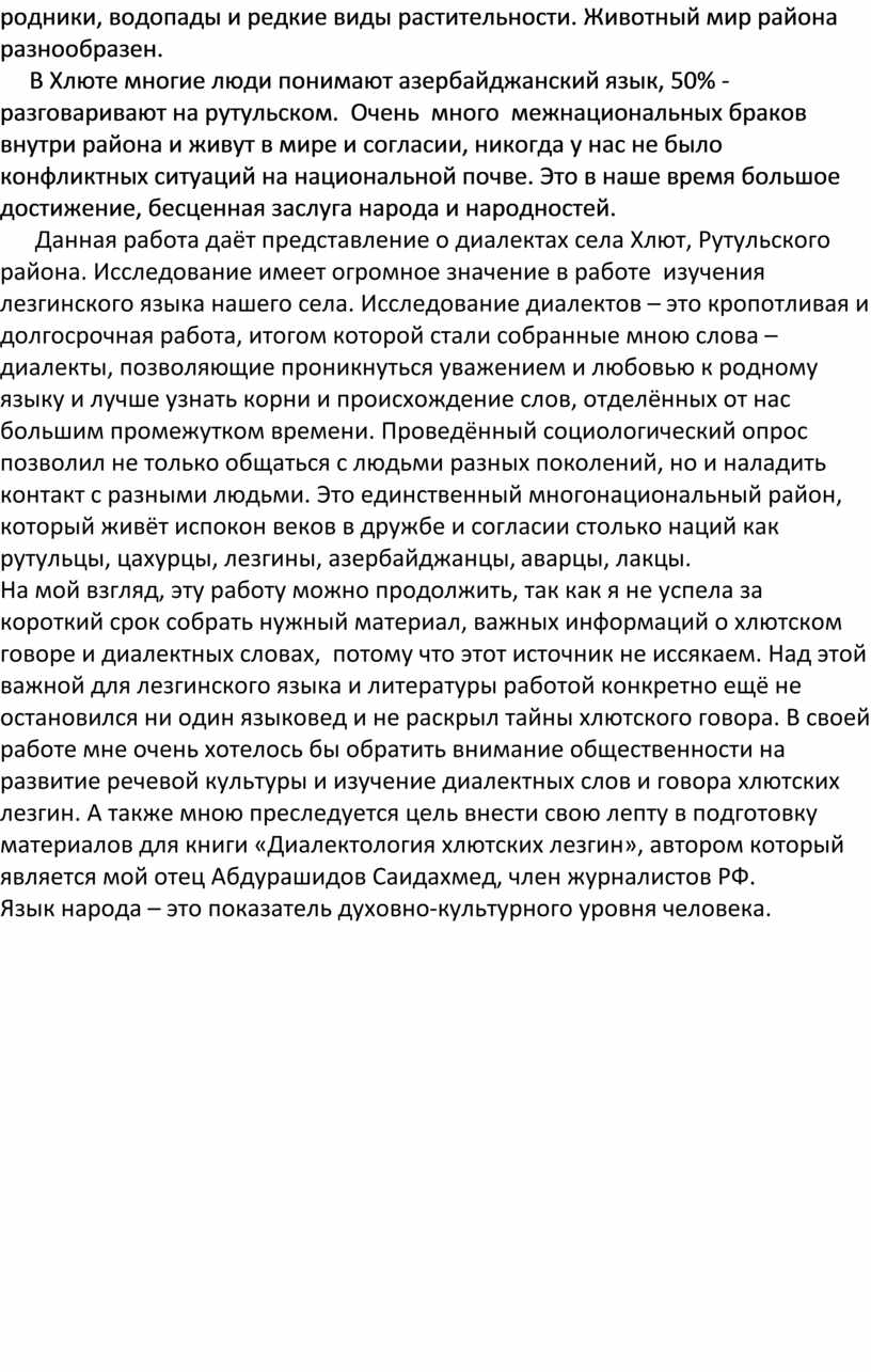 «Особенности диалекта лезгинского языка (взаимовлияние языков) в селении Хлют Рутульского района»