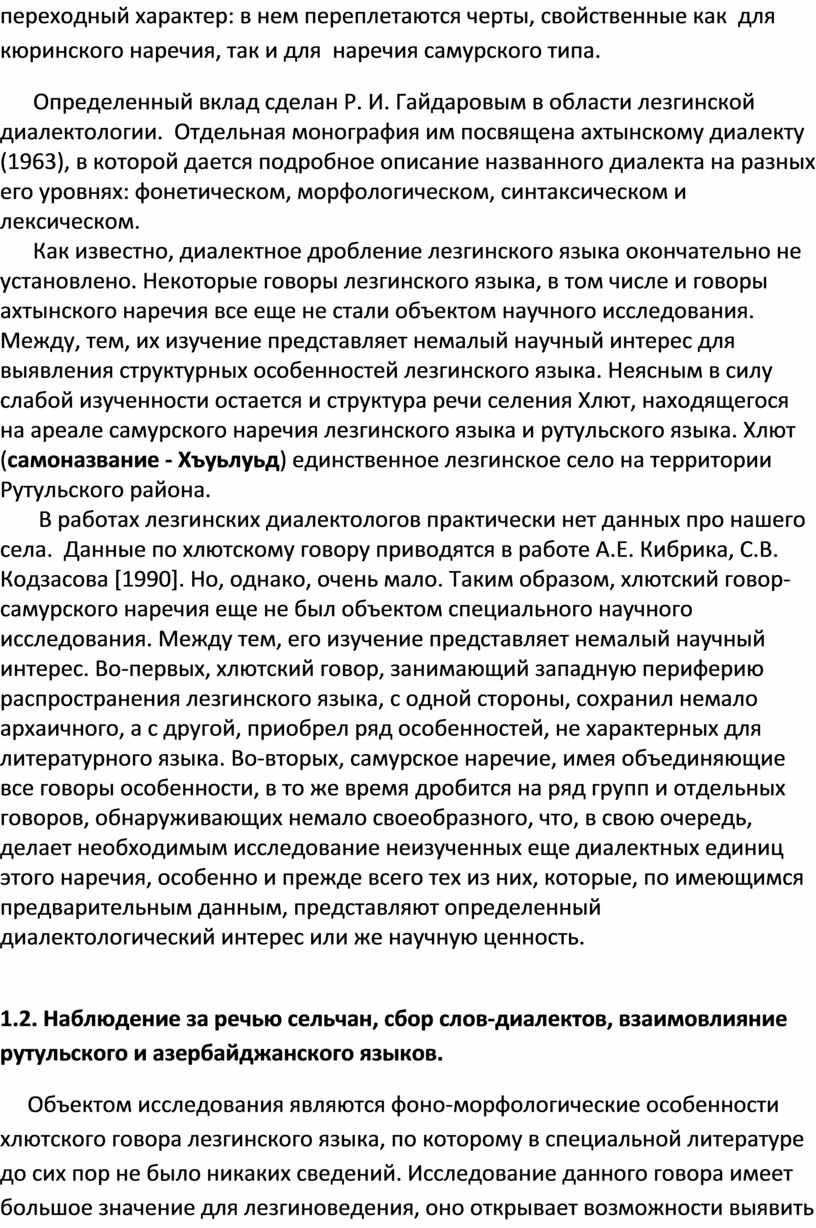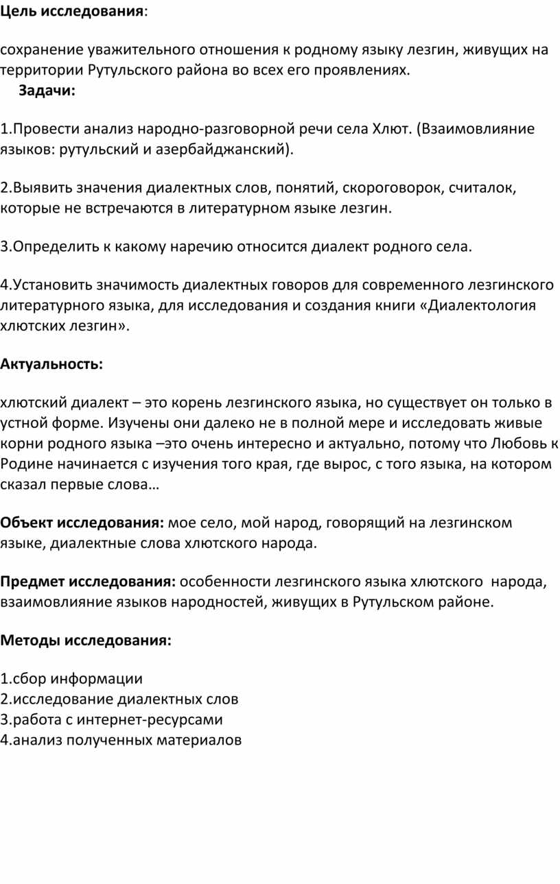 Предмет исследования: особенности лезгинского языка хлютского народа, взаимовлияние языков народностей, живущих в Рутульском районе.