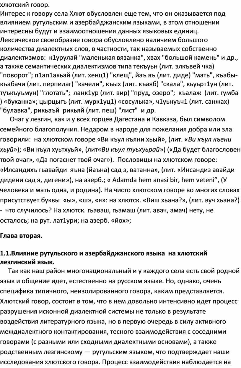 Так как наш район многонациональный и у каждого села есть свой родной язык и общение идет, естественно на русском языке. Но, однако, очень специфика типичного, неизолированного говора, каким представляется. Хлютский говор, состоит в том, что в нем довольно интенсивно идет процесс разрушения исконной диалектной системы не только в результате воздействия литературного языка, но в первую очередь в силу активного междиалектного контактирования, тесного взаимодействия с соседними говорами (с разными или сходными диалектными основами), а также родственным лезгинскому — рутульским языком, что подтверждает наши исследования хлютского говора. Процесс взаимодействия наблюдается на всех уровнях языковых и диалектных систем, в результате чего исконная диалектная система становится неустойчивой, претерпевает значительные изменения; о чем свидетельствует варьирование как в плане выражения,так и в плане содержания.