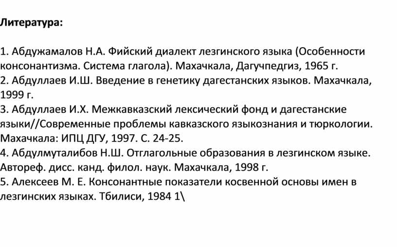 1. Абдужамалов Н.А. Фийский диалект лезгинского языка (Особенности консонантизма. Система глагола). Махачкала, Дагучпедгиз, 1965 г.