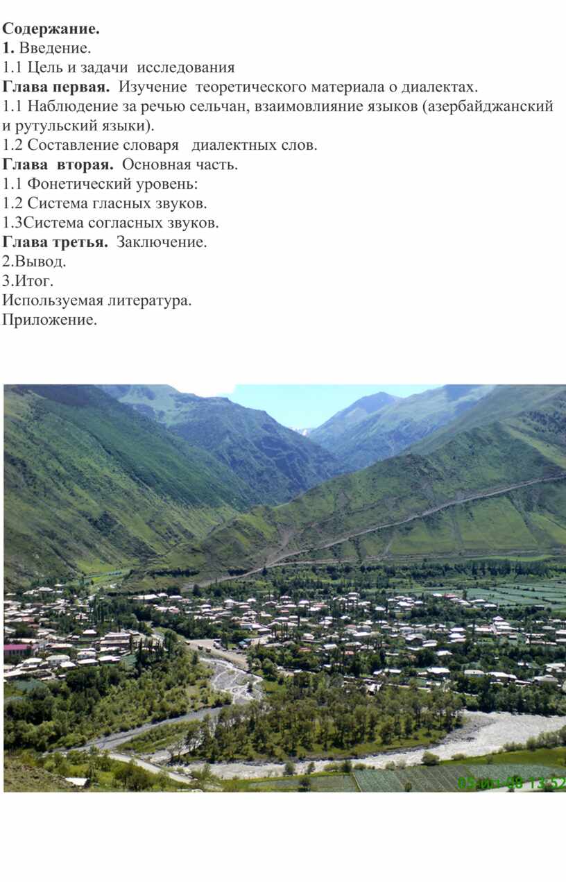 Содержание. 1. Введение. 1.1 Цель и задачи исследования Глава первая. Изучение теоретического материала о диалектах. 1.1 Наблюдение за речью сельчан, взаимовлияние языков (азербайджанский и рутульский языки). 1.2 Составление словаря диалектных слов. Глава вторая. Основная часть. 1.1 Фонетический уровень: 1.2 Система гласных звуков. 1.3Система согласных звуков. Глава третья. Заключение. 2.Вывод. 3.Итог. Используемая литература. Приложение.