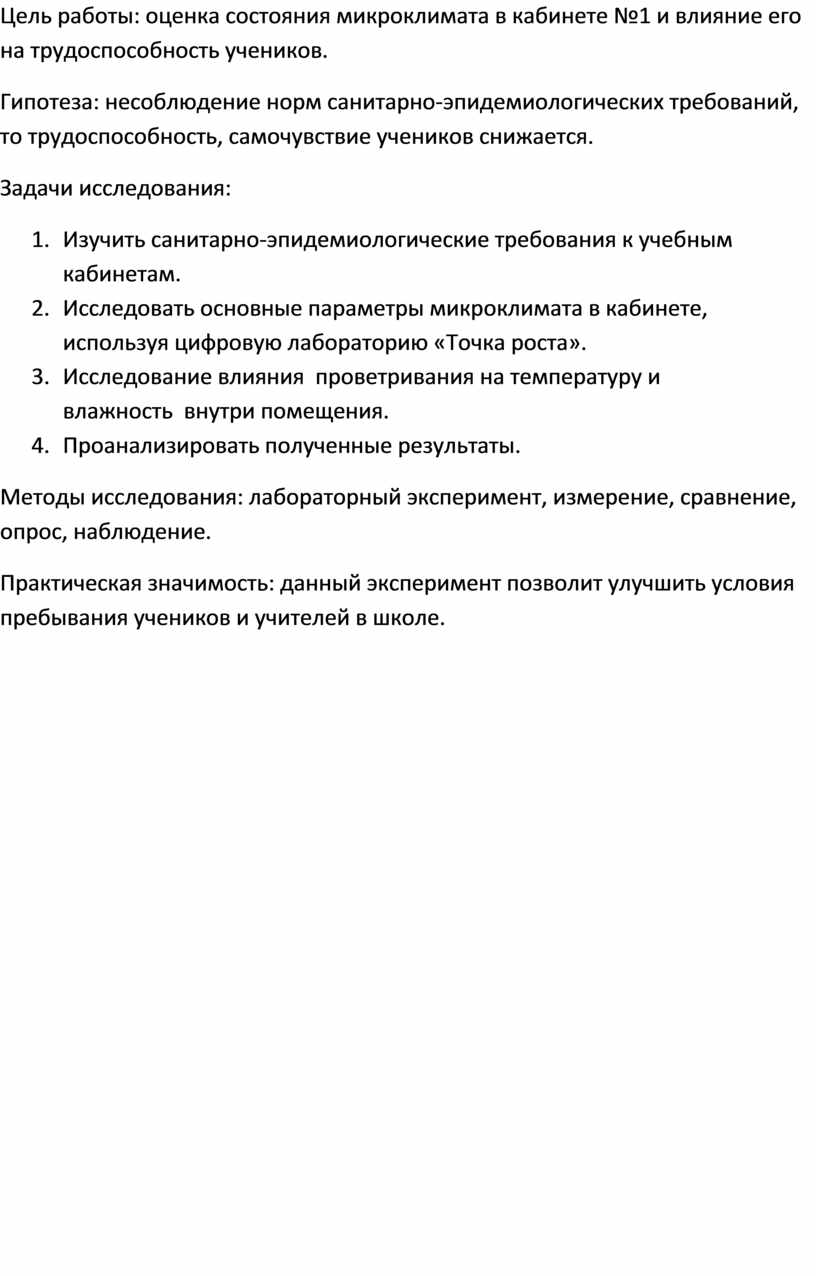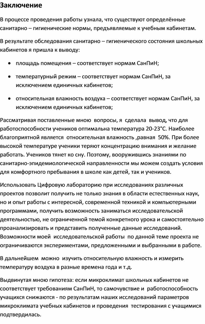 Выдвинутая мною гипотеза: если микроклимат школьных кабинетов не соответствует требованиям СанПиН, то самочувствие и работоспособность учащихся снижаются - по результатам наших исследований параметров микроклимата учебных кабинетов и проведения тестирования с учащимися подтвердилась.