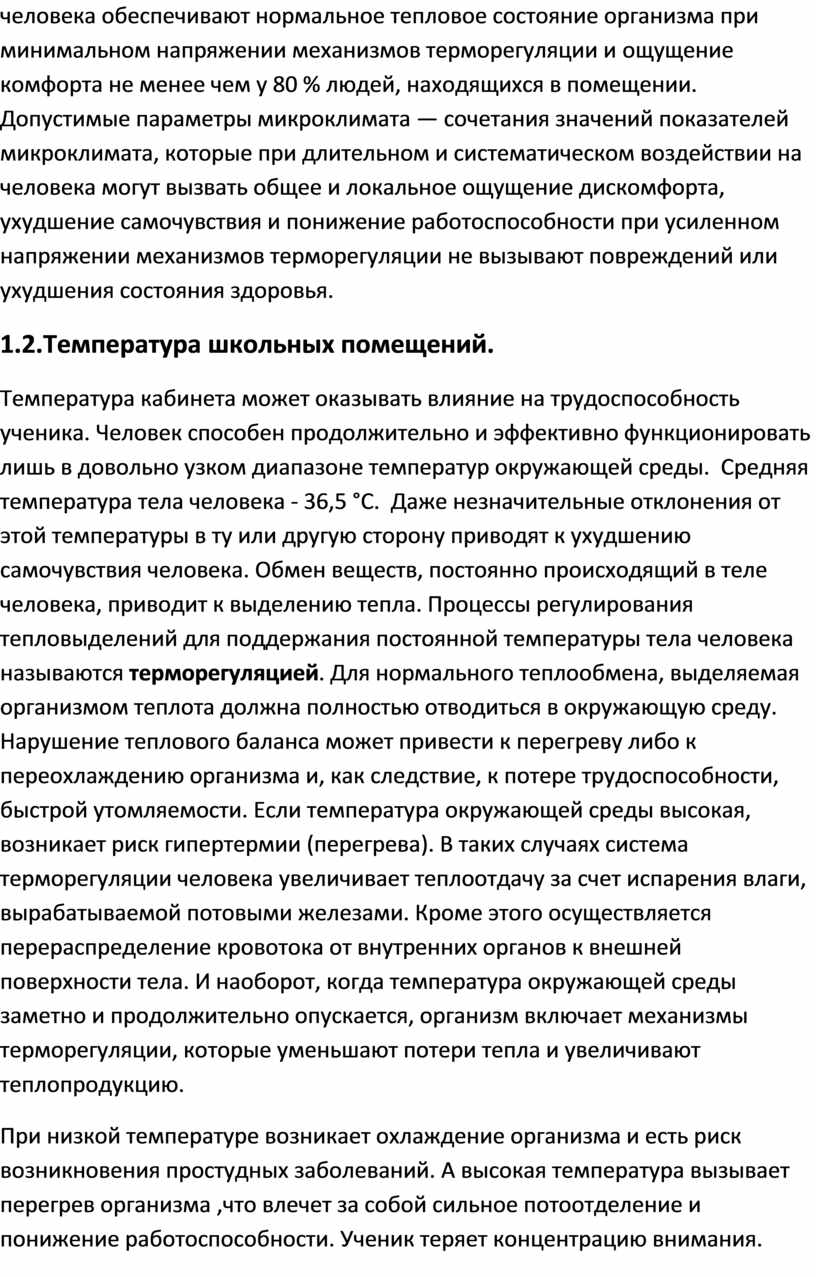 Температура кабинета может оказывать влияние на трудоспособность ученика. Человек способен продолжительно и эффективно функционировать лишь в довольно узком диапазоне температур окружающей среды. Средняя температура тела человека - 36,5 °С. Даже незначительные отклонения от этой температуры в ту или другую сторону приводят к ухудшению самочувствия человека. Обмен веществ, постоянно происходящий в теле человека, приводит к выделению тепла. Процессы регулирования тепловыделений для поддержания постоянной температуры тела человека называются терморегуляцией. Для нормального теплообмена, выделяемая организмом теплота должна полностью отводиться в окружающую среду. Нарушение теплового баланса может привести к перегреву либо к переохлаждению организма и, как следствие, к потере трудоспособности, быстрой утомляемости. Если температура окружающей среды высокая, возникает риск гипертермии (перегрева). В таких случаях система терморегуляции человека увеличивает теплоотдачу за счет испарения влаги, вырабатываемой потовыми железами. Кроме этого осуществляется перераспределение кровотока от внутренних органов к внешней поверхности тела. И наоборот, когда температура окружающей среды заметно и продолжительно опускается, организм включает механизмы терморегуляции, которые уменьшают потери тепла и увеличивают теплопродукцию.