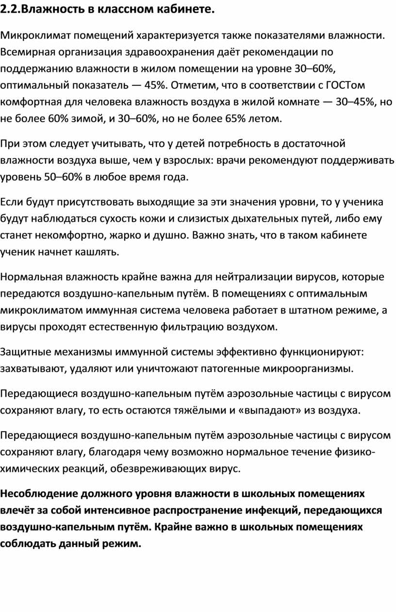Несоблюдение должного уровня влажности в школьных помещениях влечёт за собой интенсивное распространение инфекций, передающихся воздушно-капельным путём. Крайне важно в школьных помещениях соблюдать данный режим.