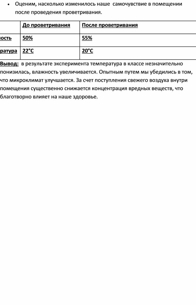 Вывод: в результате эксперимента температура в классе незначительно понизилась, влажность увеличивается. Опытным путем мы убедились в том, что микроклимат улучшается. За счет поступления свежего воздуха внутри помещения существенно снижается концентрация вредных веществ, что благотворно влияет на наше здоровье.