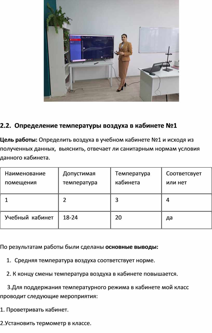 Цель работы: Определить воздуха в учебном кабинете №1 и исходя из полученных данных, выяснить, отвечает ли санитарным нормам условия данного кабинета.