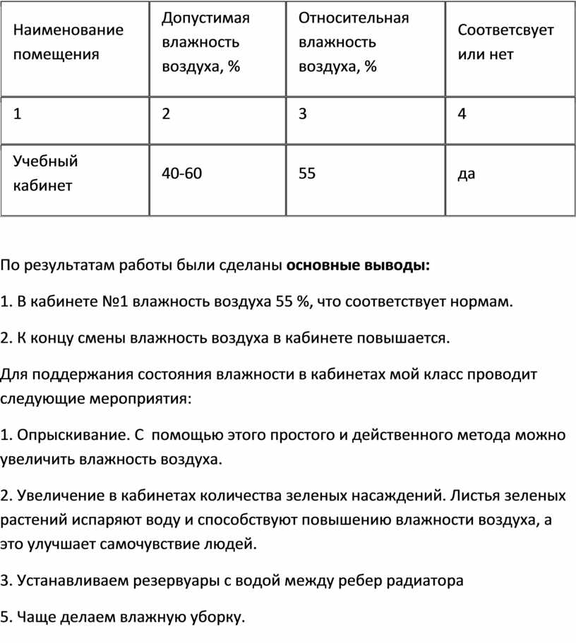 1. В кабинете №1 влажность воздуха 55 %, что соответствует нормам.