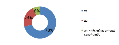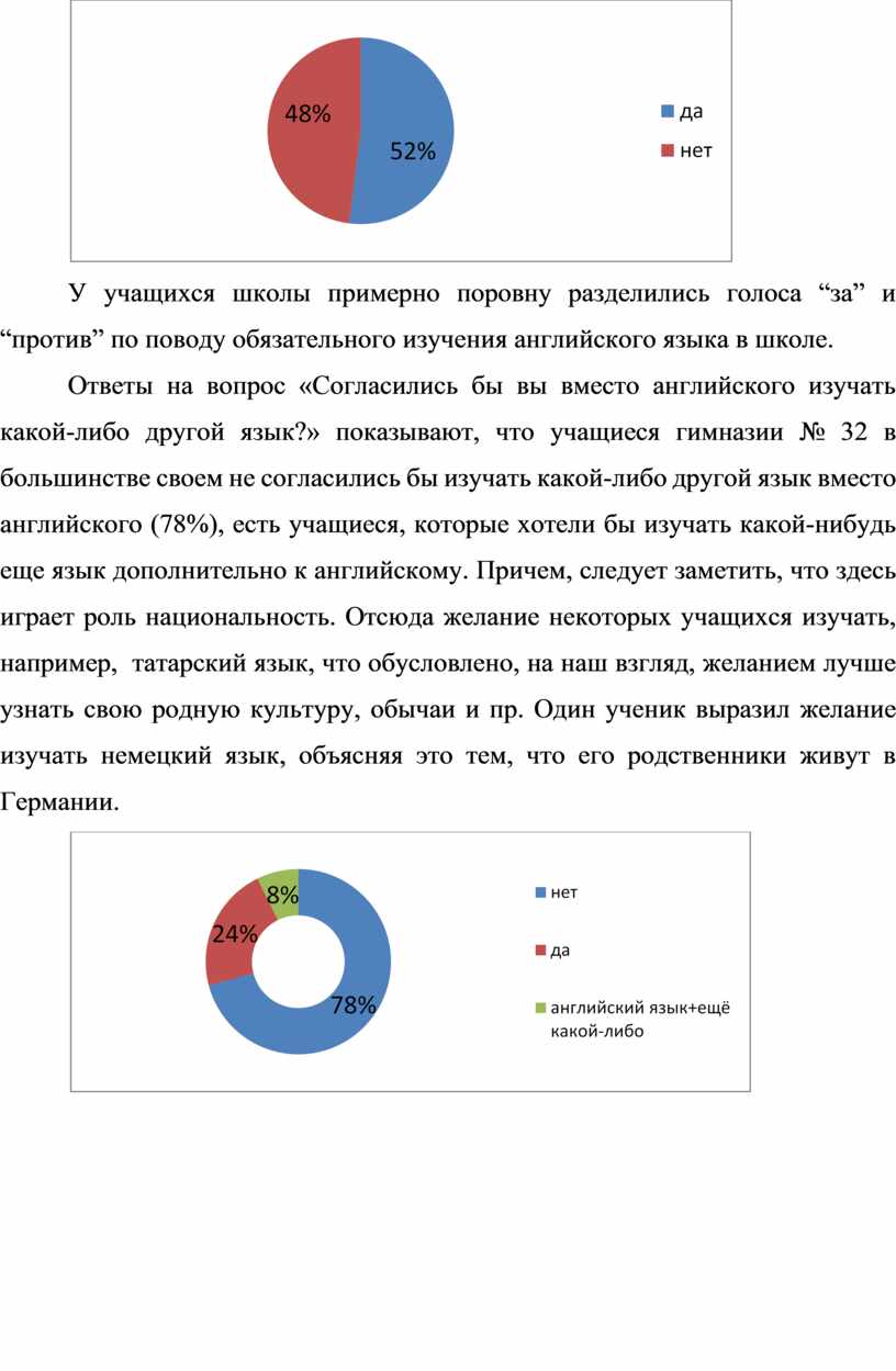 Ответы на вопрос «Согласились бы вы вместо английского изучать какой-либо другой язык?» показывают, что учащиеся гимназии № 32 в большинстве своем не согласились бы изучать какой-либо другой язык вместо английского (78%), есть учащиеся, которые хотели бы изучать какой-нибудь еще язык дополнительно к английскому. Причем, следует заметить, что здесь играет роль национальность. Отсюда желание некоторых учащихся изучать, например, татарский язык, что обусловлено, на наш взгляд, желанием лучше узнать свою родную культуру, обычаи и пр. Один ученик выразил желание изучать немецкий язык, объясняя это тем, что его родственники живут в Германии.