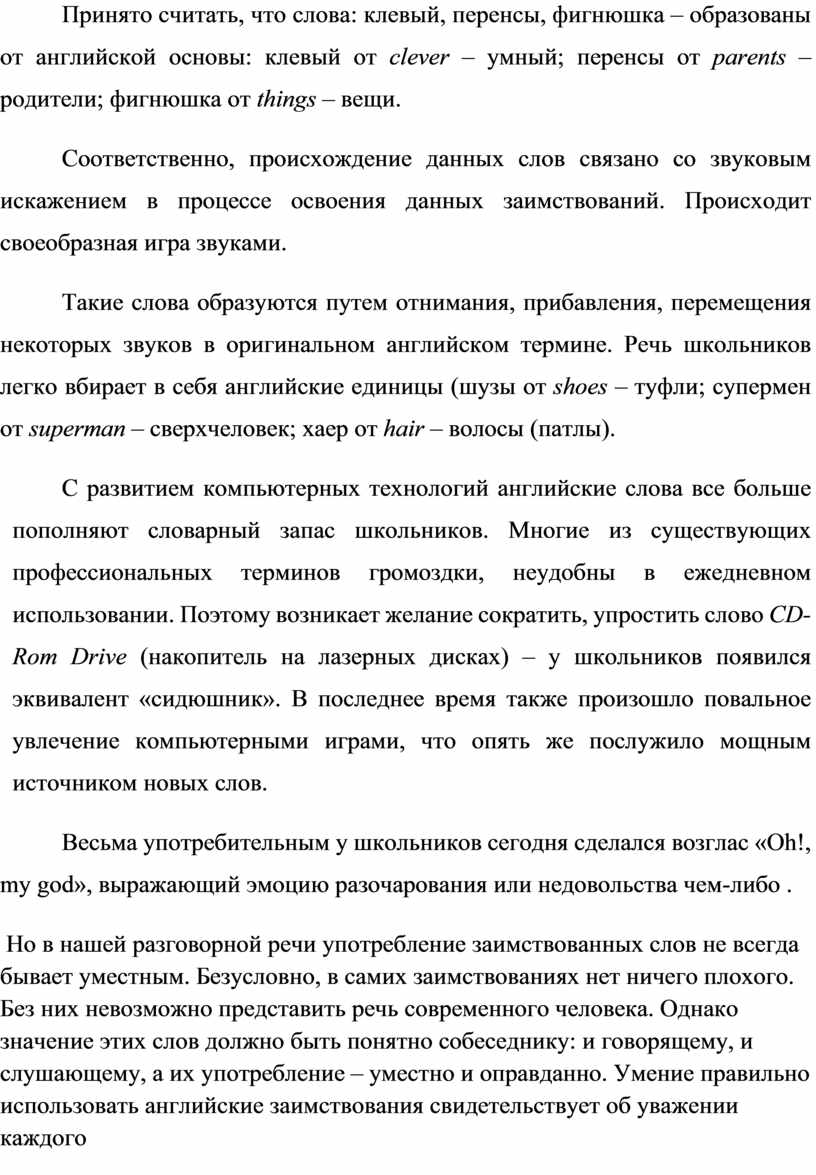 Англицизмы, употребляемые школьниками, подчеркивают уровень их информированности, превосходство над остальными. Иностранные слова в речи учащихся могут играть роль своеобразных цитат: какой-либо термин может цитироваться, сознательно обыгрываться, искажаться. При этом имеет место русское или просто неправильное прочтение английского слова. Порой ошибка становится привлекательной до того, что ею «овладевает» каждый школьник.