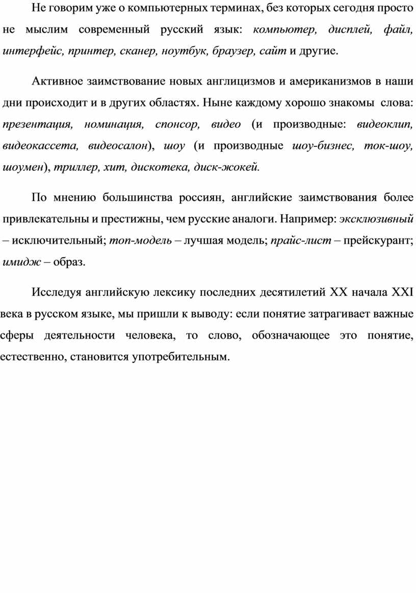 Исследуя английскую лексику последних десятилетий ХХ начала XXI века в русском языке, мы пришли к выводу: если понятие затрагивает важные сферы деятельности человека, то слово, обозначающее это понятие, естественно, становится употребительным.