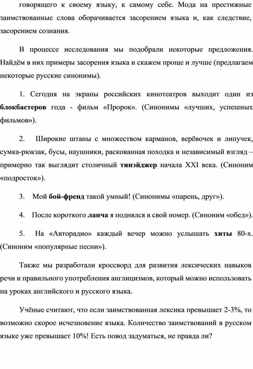Также мы разработали кроссворд для развития лексических навыков речи и правильного употребления англицизмов, который можно использовать на уроках английского и русского языка.