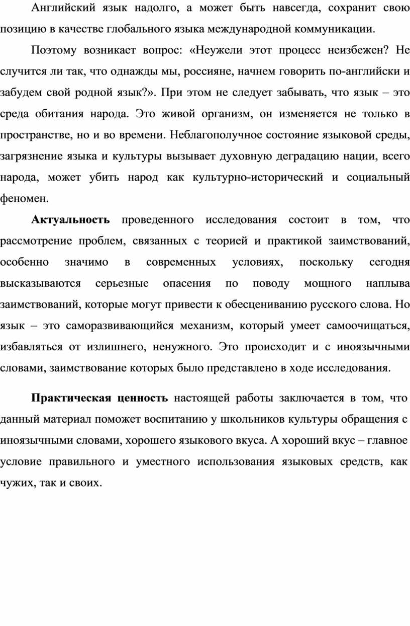 Поэтому возникает вопрос: «Неужели этот процесс неизбежен? Не случится ли так, что однажды мы, россияне, начнем говорить по-английски и забудем свой родной язык?». При этом не следует забывать, что язык – это среда обитания народа. Это живой организм, он изменяется не только в пространстве, но и во времени. Неблагополучное состояние языковой среды, загрязнение языка и культуры вызывает духовную деградацию нации, всего народа, может убить народ как культурно-исторический и социальный феномен.