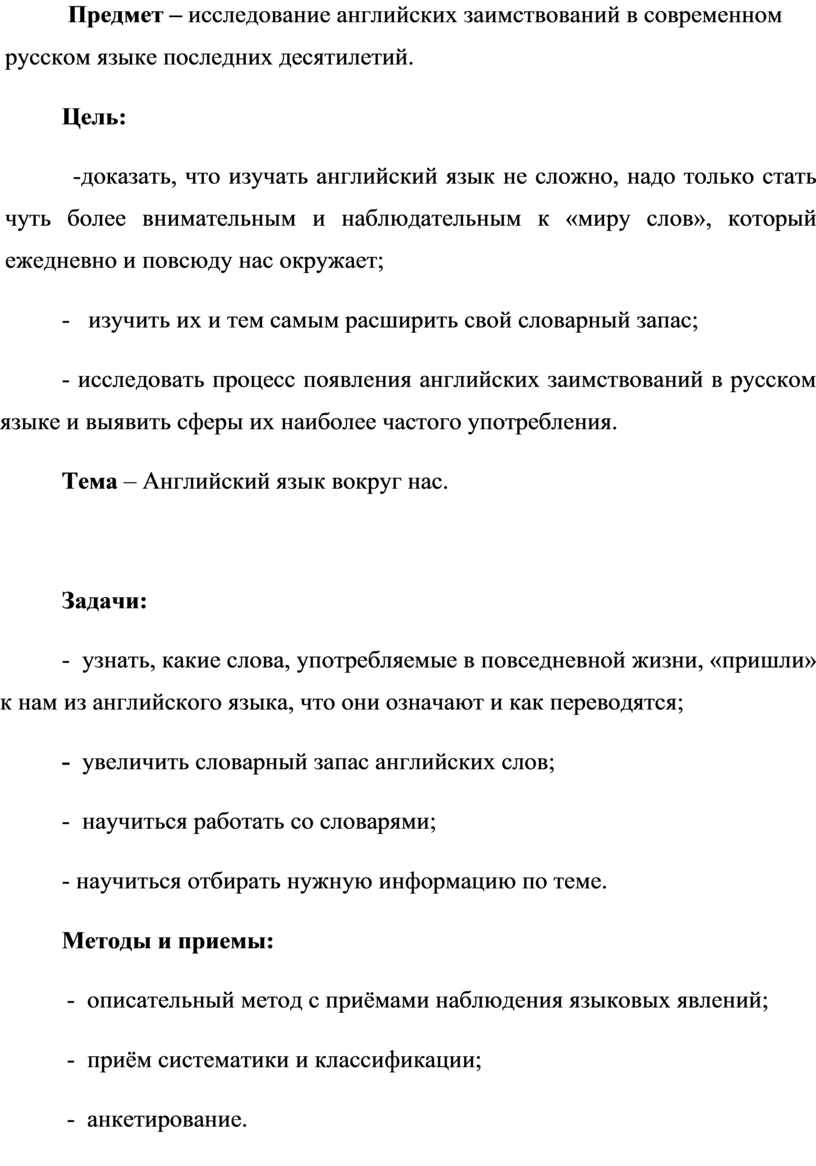 - исследовать процесс появления английских заимствований в русском языке и выявить сферы их наиболее частого употребления.