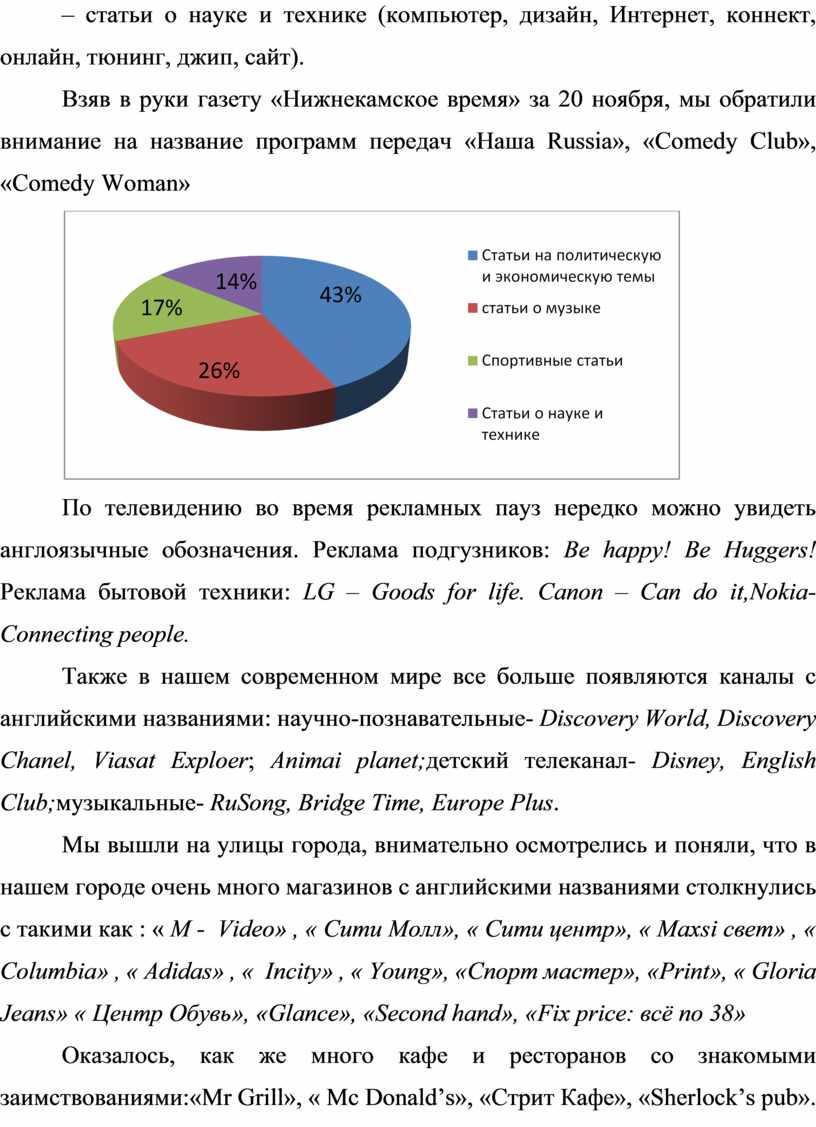 Мы проанализировали ряд газетных материалов (газеты «Нижнекамское время», «Единство» за ноябрь 2013 года) и установили, что чаще всего слова английского происхождения используются в рубриках: