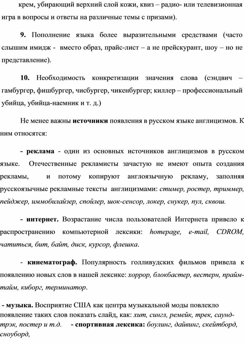 Не менее важны источники появления в русском языке англицизмов. К ним относятся: