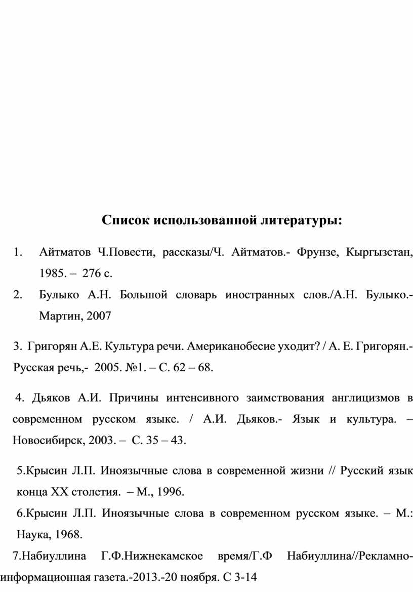5.Крысин Л.П. Иноязычные слова в современной жизни // Русский язык конца ХХ столетия. – М., 1996.