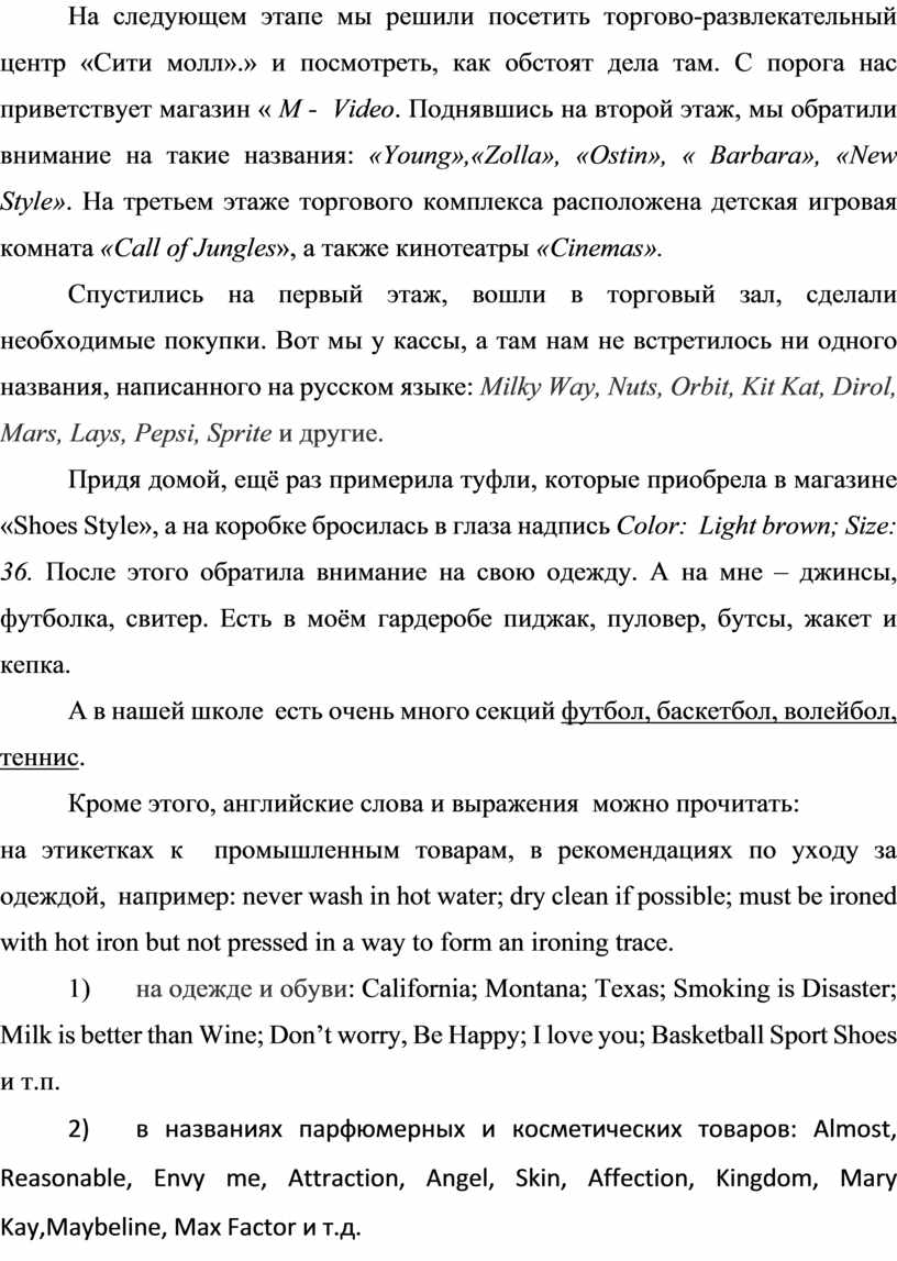 Мы вышли на улицы города, внимательно осмотрелись и поняли, что в нашем городе очень много магазинов с английскими названиями столкнулись с такими как : « M - Video» , « Сити Молл», « Сити центр», « Maxsi свет» , « Columbia» , « Adidas» , « Incity» , « Young», «Спорт мастер», «Print», « Gloria Jeans» « Центр Обувь», «Glance», «Second hand», «Fix price: всё по 38»