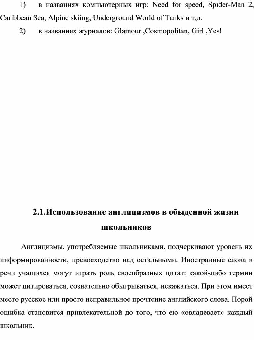 2.1.Использование англицизмов в обыденной жизни школьников……………………………………………………………………...13