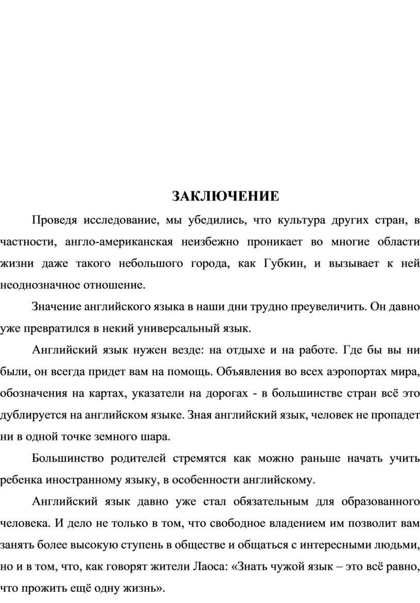 Проведя исследование, мы убедились, что культура других стран, в частности, англо-американская неизбежно проникает во многие области жизни даже такого небольшого города, как Губкин, и вызывает к ней неоднозначное отношение.