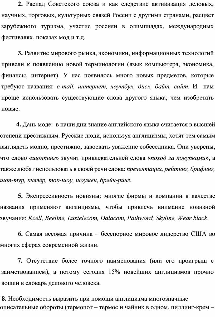 Каковы же причины этого огромного потока англицизмов в русской речи? Мы выделим наиболее важные на наш взгляд: