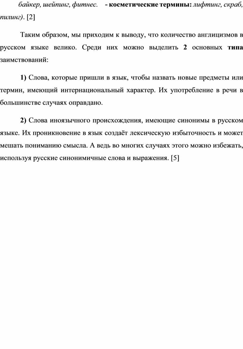 Таким образом, мы приходим к выводу, что количество англицизмов в русском языке велико. Среди них можно выделить 2 основных типа заимствований:
