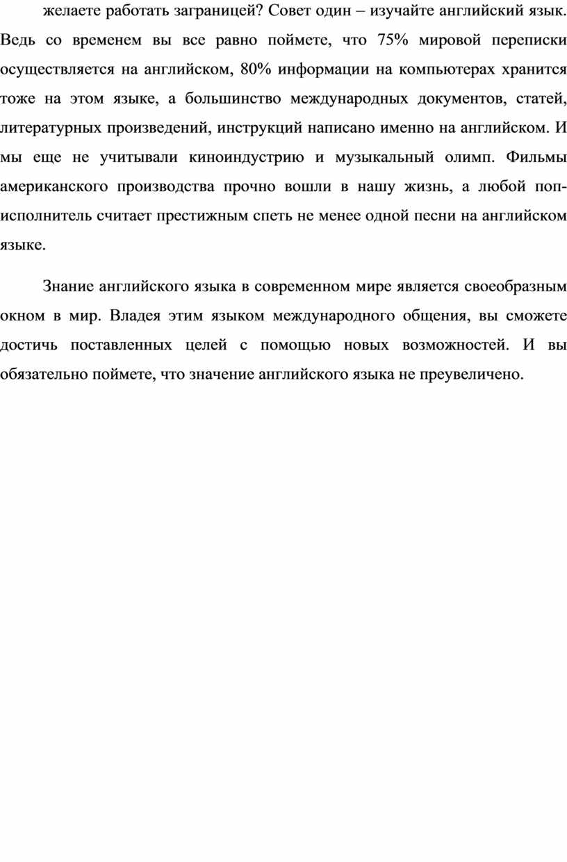 И все-таки учить английский язык стоит. Хотите путешествовать и не чувствовать себя белой вороной, а свободно общаться с людьми разных национальностей? Хотите стать студентом зарубежного университета? Хотите престижную работу с продвижением по карьерной лестнице? А, может, вы желаете работать заграницей? Совет один – изучайте английский язык. Ведь со временем вы все равно поймете, что 75% мировой переписки осуществляется на английском, 80% информации на компьютерах хранится тоже на этом языке, а большинство международных документов, статей, литературных произведений, инструкций написано именно на английском. И мы еще не учитывали киноиндустрию и музыкальный олимп. Фильмы американского производства прочно вошли в нашу жизнь, а любой поп-исполнитель считает престижным спеть не менее одной песни на английском языке.