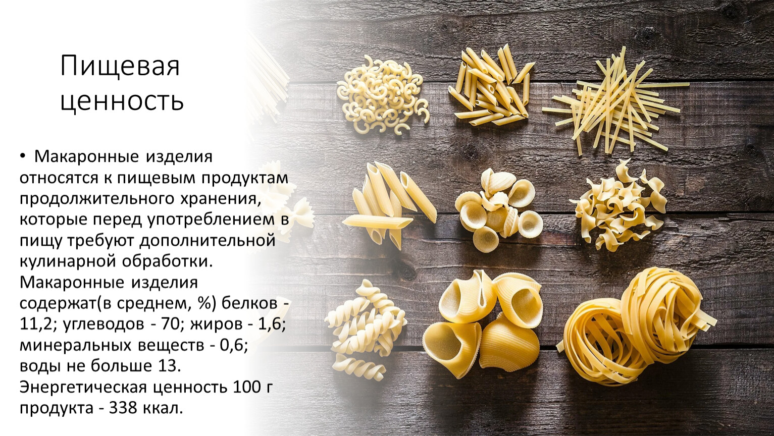 Макаронные изделия относятся к пищевым продуктам продолжительного хранения, которые перед употреблением в пищу требуют дополнительной кулинарной обработки. Макаронные изделия содержат(в среднем, %) белков - 11,2; углеводов - 70; жиров - 1,6; минеральных веществ - 0,6; воды не больше 13. Энергетическая ценность 100 г продукта - 338 ккал.