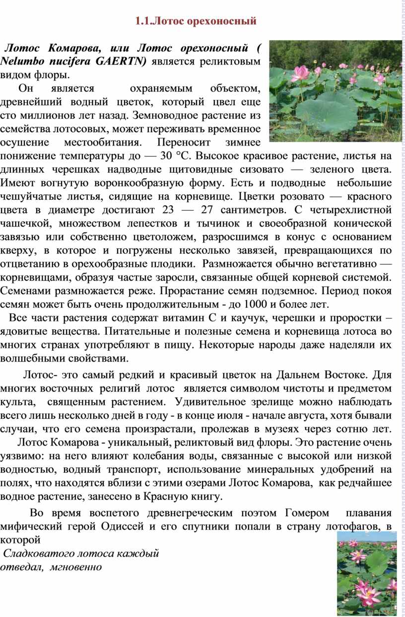 Лотос Комарова, или Лотос орехоносный ( Nelumbo nucifera GAERTN) является реликтовым видом флоры.