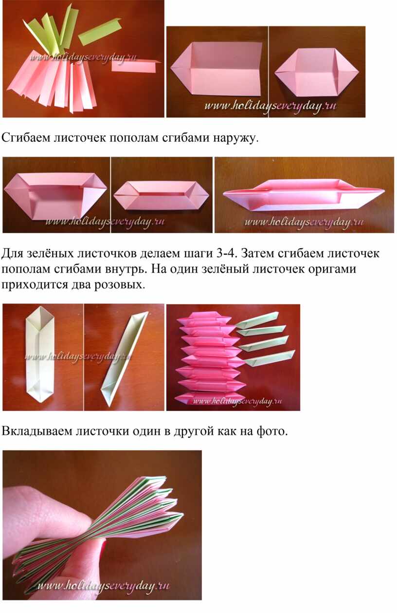 Для зелёных листочков делаем шаги 3-4. Затем сгибаем листочек пополам сгибами внутрь. На один зелёный листочек оригами приходится два розовых.