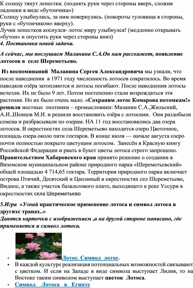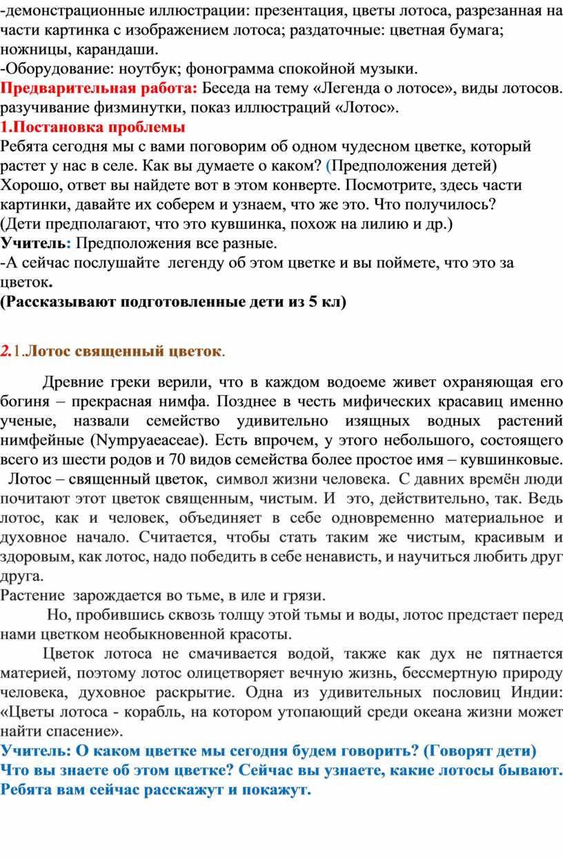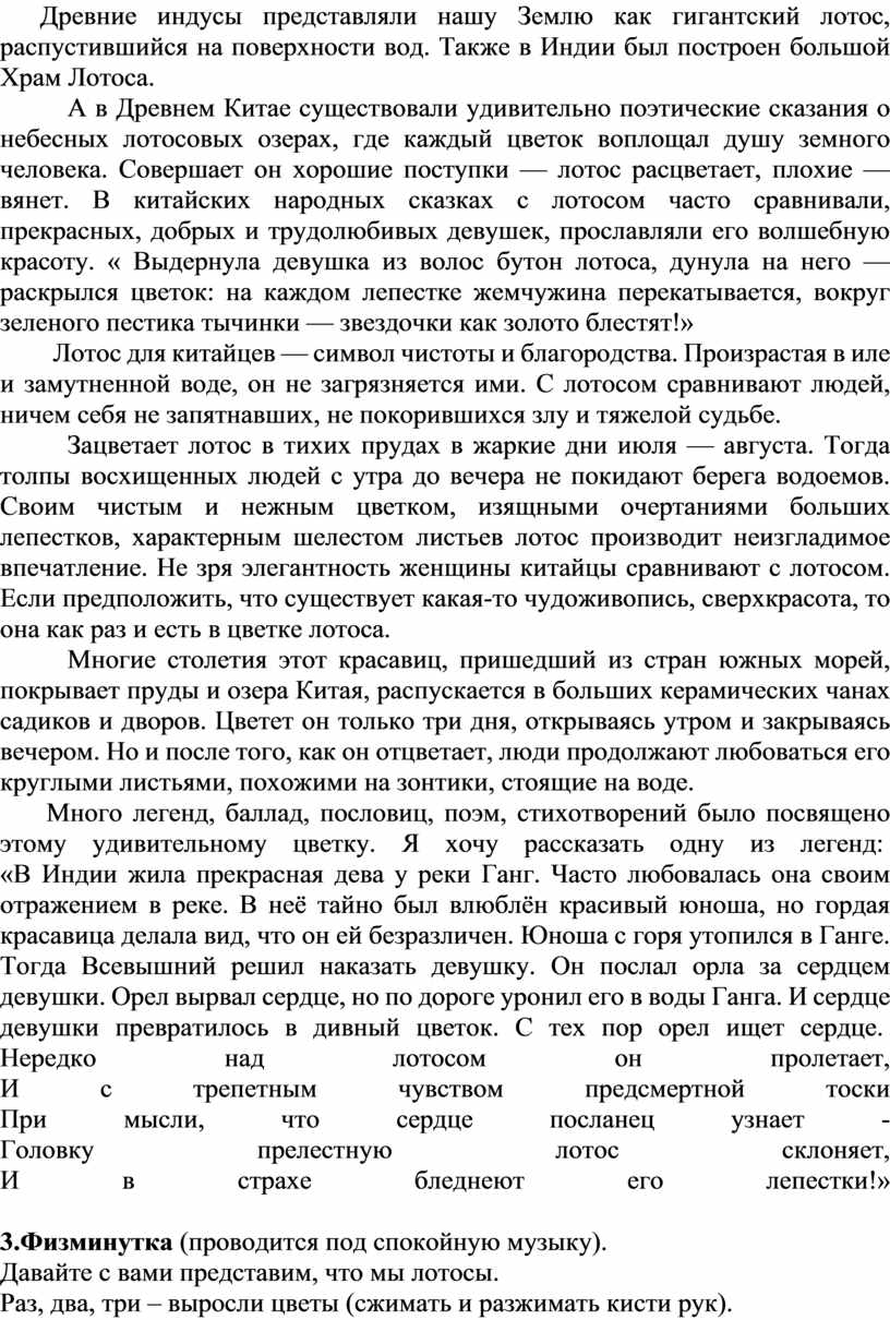 Предварительная работа: Беседа на тему «Легенда о лотосе», виды лотосов. разучивание физминутки, показ иллюстраций «Лотос».