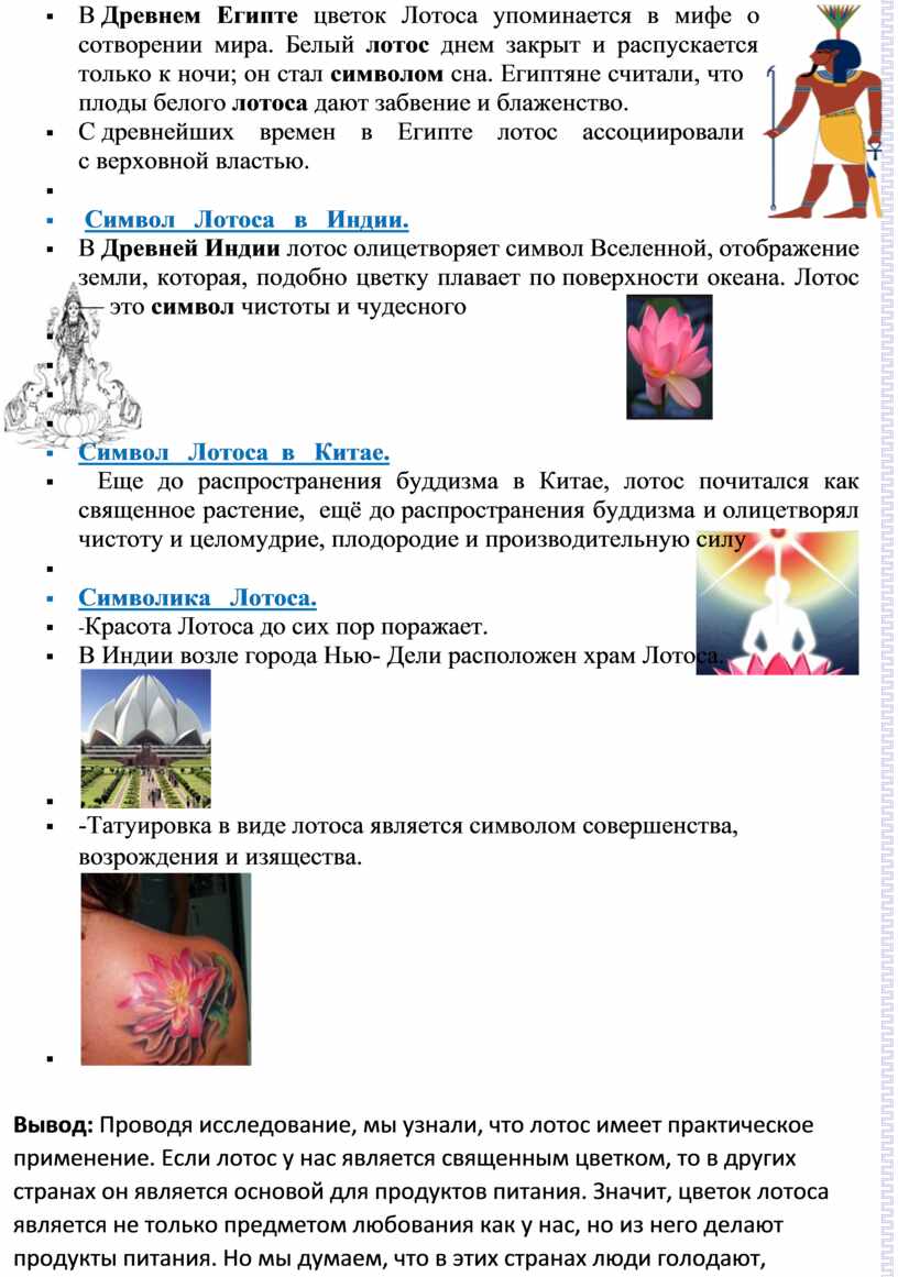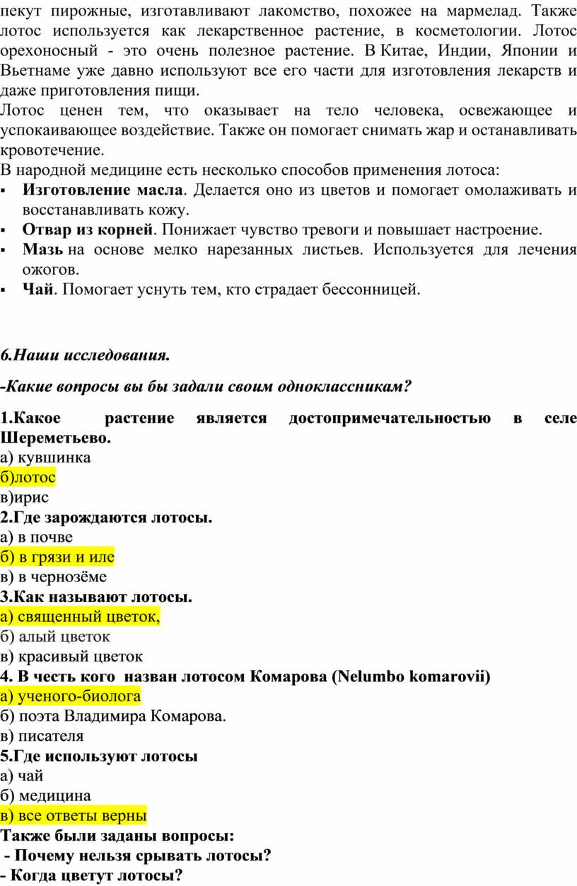 Вывод: Проводя исследование, мы узнали, что лотос имеет практическое применение. Если лотос у нас является священным цветком, то в других странах он является основой для продуктов питания. Значит, цветок лотоса является не только предметом любования как у нас, но из него делают продукты питания. Но мы думаем, что в этих странах люди голодают, поэтому их лотос спасает от голода. Может быть, поэтому в Индии тоже почитают его священность. Из него делают посуду, из зерен делают муку, пекут пирожные, изготавливают лакомство, похожее на мармелад. Также лотос используется как лекарственное растение, в косметологии. Лотос орехоносный - это очень полезное растение. В Китае, Индии, Японии и Вьетнаме уже давно используют все его части для изготовления лекарств и даже приготовления пищи.