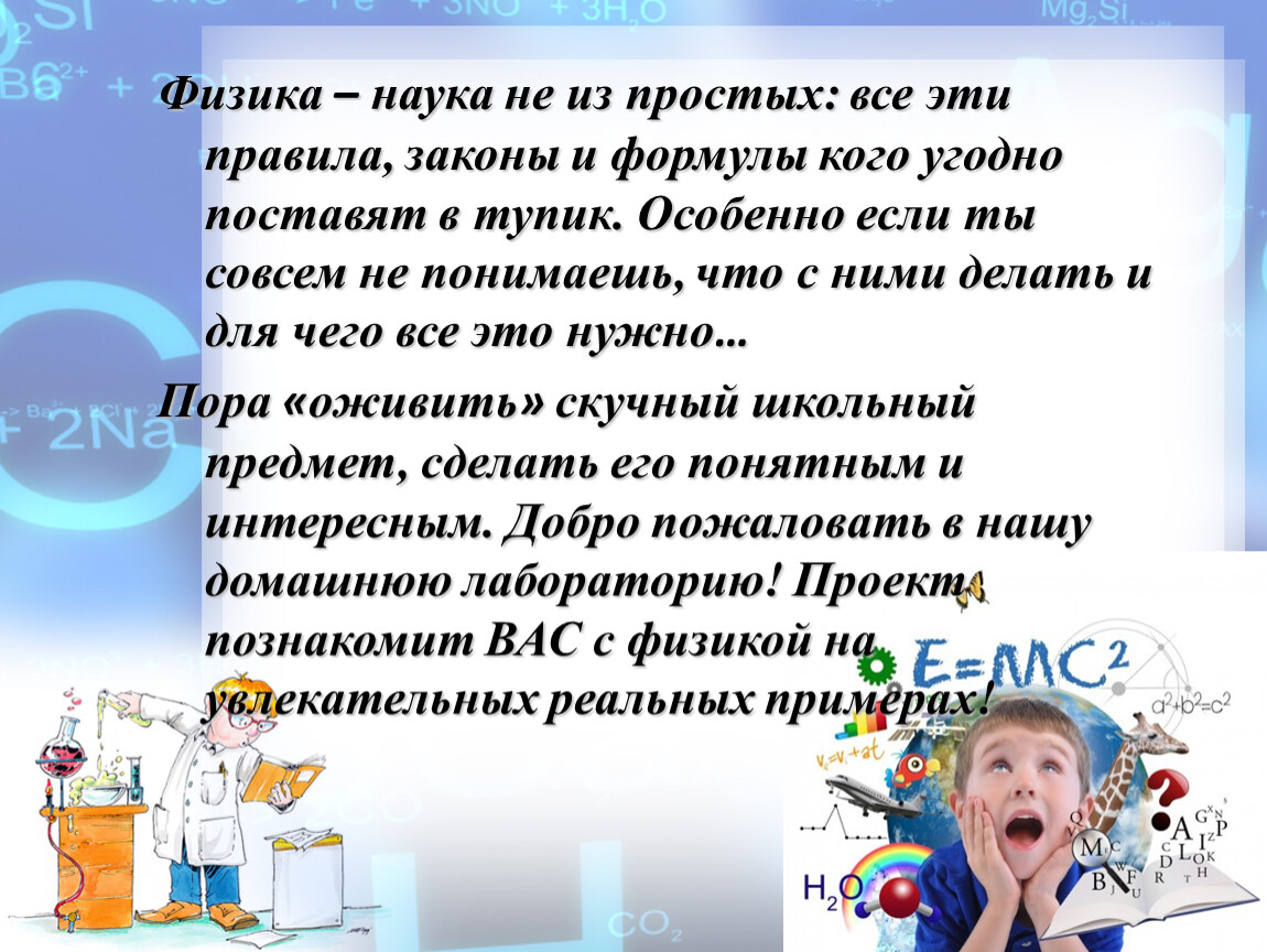 Пора «оживить» скучный школьный предмет, сделать его понятным и интересным. Добро пожаловать в нашу домашнюю лабораторию! Проект познакомит ВАС с физикой на увлекательных реальных примерах!