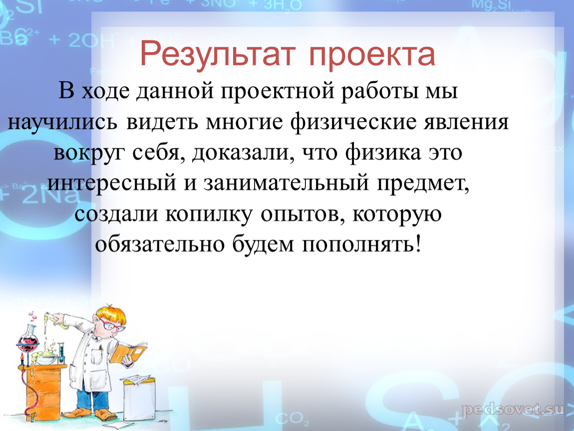 В ходе данной проектной работы мы научились видеть многие физические явления вокруг себя, доказали, что физика это интересный и занимательный предмет, создали копилку опытов, которую обязательно будем пополнять!