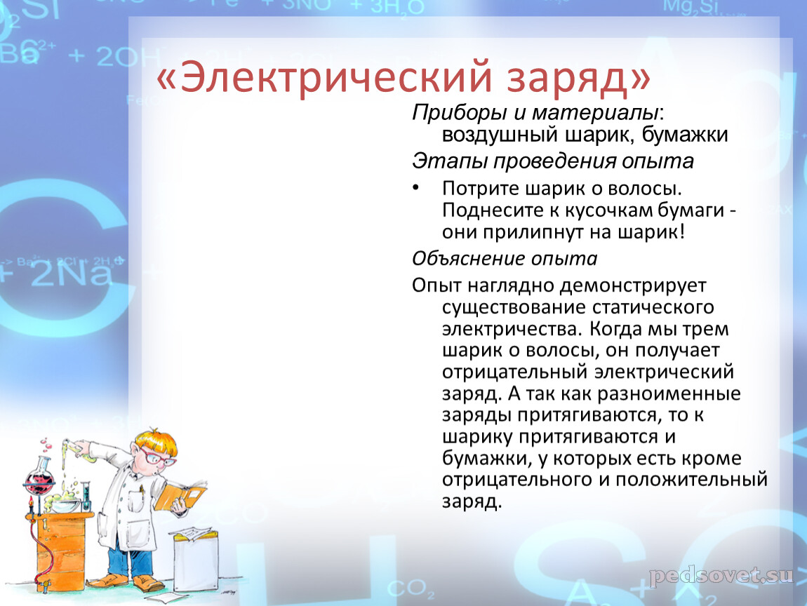 Опыт наглядно демонстрирует существование статического электричества. Когда мы трем шарик о волосы, он получает отрицательный электрический заряд. А так как разноименные заряды притягиваются, то к шарику притягиваются и бумажки, у которых есть кроме отрицательного и положительный заряд.